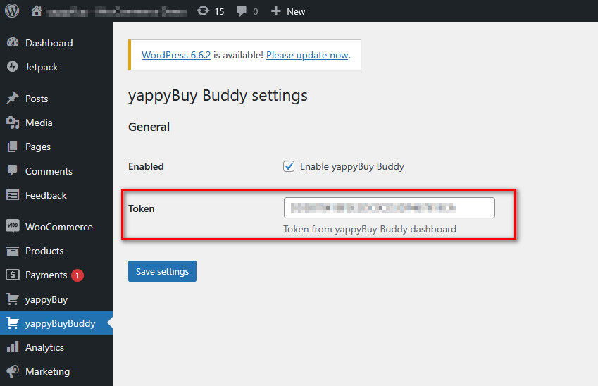 Download plugin archive here and upload it to WP-Admin dashboard as showed and above article. Enable the plugin, set Token you got from yappyBuy Buddy dashboard (see related article how to do that):