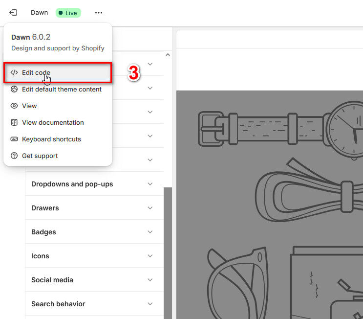 Select layout/theme.liquid file (4) and add code you got from yappyBuy Buddy dashboard (see related article how to do that)